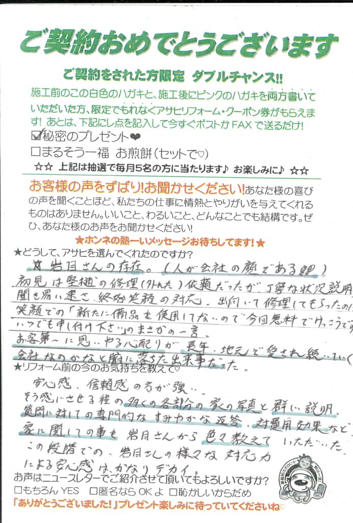 岩目さんの存在(人が会社の顔である)初見は堅樋の修理(外れた)依頼だったが丁寧な状況説明、聞きやすい速さ、終始笑顔の対応、出向いて修理してもらったのに笑顔で「新たに備品を使用していないので今回は無料で結構です。いつでも申し付けください」のまさかの一言。お客第一に思いやる心配りが長年地元で愛され続けていく会社なのかなと腑に落ちた出来事でした。