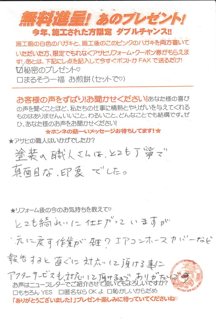 口コミ評判とても丁寧で真面目な印象越谷市七左町 Mさまカスタマーレビュー ★★★★★Q.アサヒの職人はいかがでしたか?塗装の職人さんはとても丁寧で真面目な印象でした。Q.今の気持ちを教えて!とてもきれいい仕上がっていますがもとに戻す作業が雑?エアコンホースカバーなど報告するとすぐに対応して頂けるのでありがたいです。