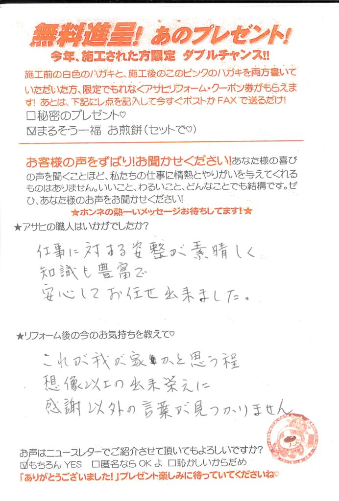 仕事に対する姿勢がすばらしく知識も豊富で安心しておまかせ出来ました。