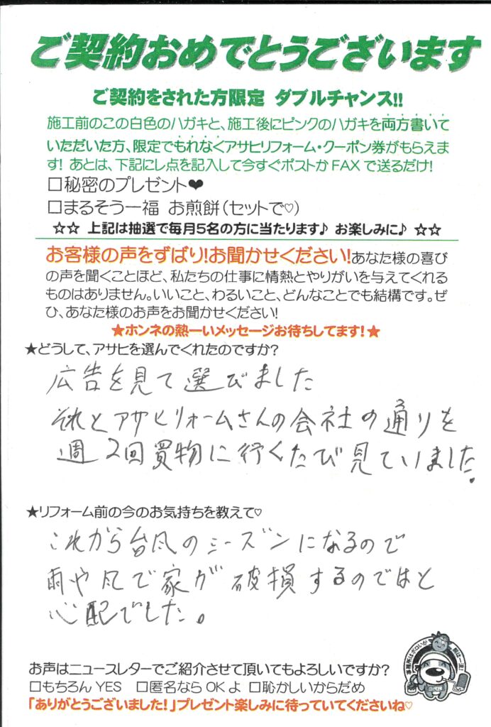 口コミ評判広告を見て選びました草加市八幡 Tさま通常は1枚ずつ掲載してください。カスタマーレビュー ★★★★★Q.どうしてアサヒを選んでくれたのですか?広告を見て選びました。それと、アサヒリフォームの会社の通りを週2回買い物に行くたびに見ていました。Q.リフォーム前の今の気持ちを教えて!これから台風のシーズンになるので、雨や風で家が破損するのではと心配ですたい出費なので、満足いく仕上がりになるのかは少し不安でした。今大変満足しています。草加市八幡町Sさま