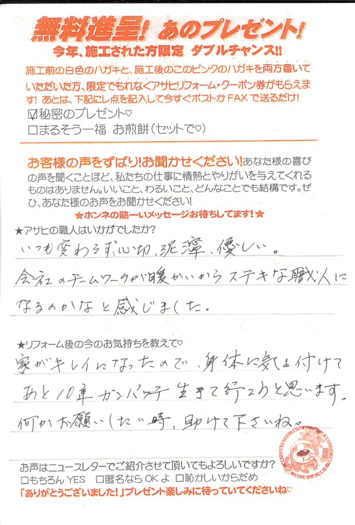口コミ評判いつも変わらず親切、丁寧、優しい草加市氷川町 Sさまカスタマーレビュー ★★★★★Q.アサヒの職人はいかがでしたか?いつも変わらず親切、丁寧、優しい。会社のチームワークが暖かいからステキな職人になるのかなと感じました。Q.今の気持ちを教えて!家がきれいになったので、体に気を付けてあと10年ガンバッテ生きていこうと思います。何かお願いしたいこと時助けてくださいね。