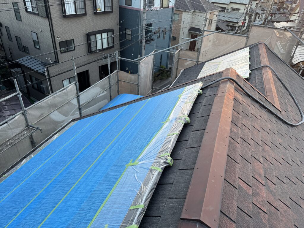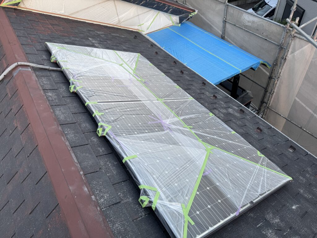 今回のお宅の屋根は太陽光パネルが付いているお宅ですので先に塗料で汚さないようにビニールやブルーシートで養生していきます。