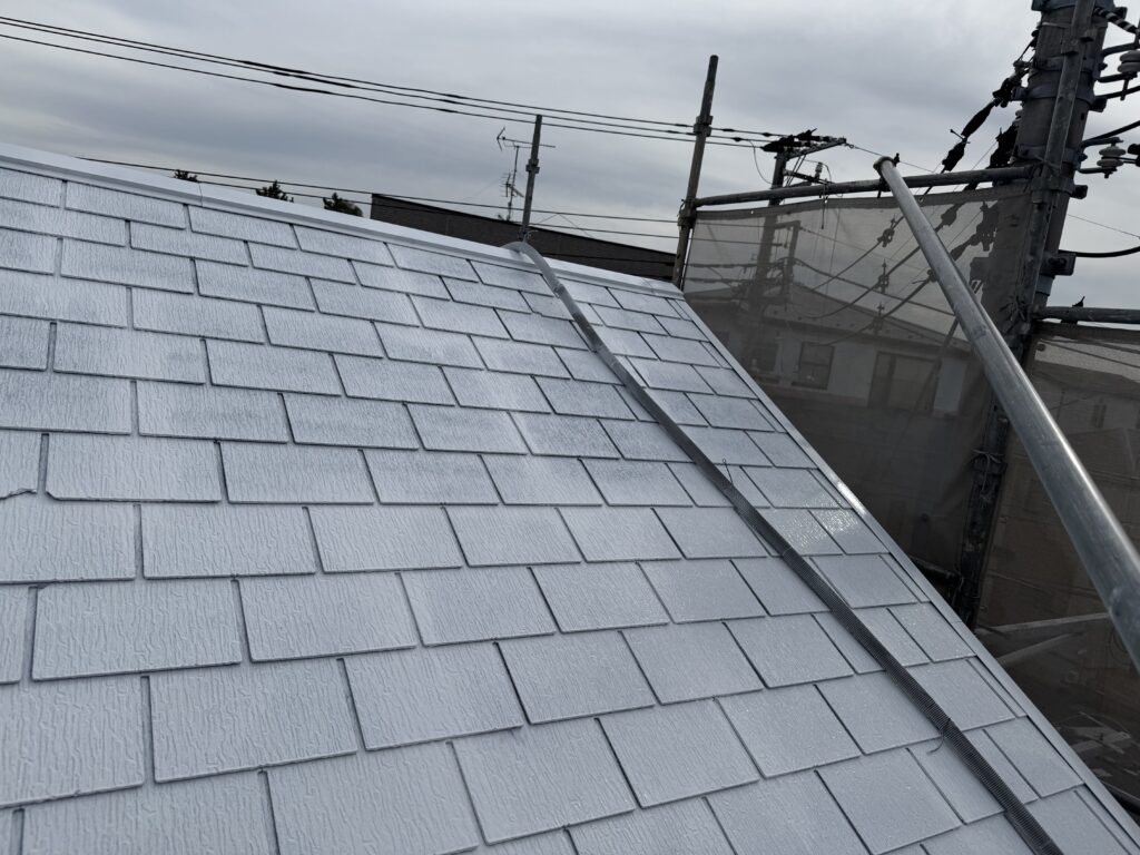 屋根材(コロニアル)の劣化が進んでいましたので下塗り塗料の染み込みがかなり激しかったのでたっぷり塗装してコロニアルに染み込まなくなるまで塗料を付けて塗装しました。