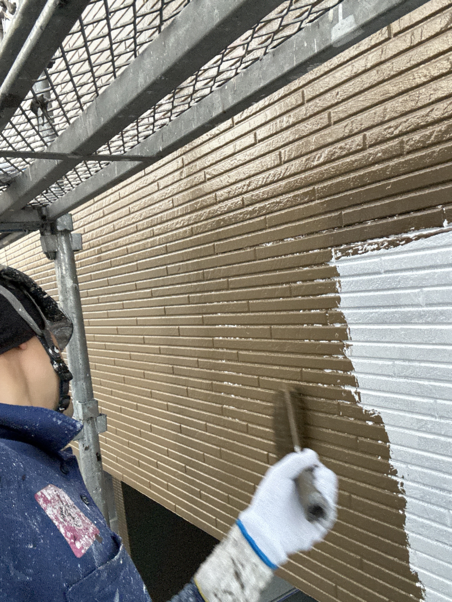 今日は、越谷市袋山でブラウンとホワイトツートンカラーのサイディングの外壁塗装現場で、