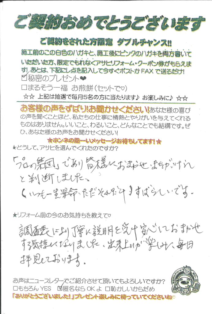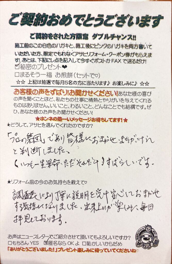 口コミ評判「プロの集団」であり皆さまにおまかせまちがいないと判断しました越谷市蒲生南 Oさまカスタマーレビュー ★★★★★Q.どうしてアサヒを選んでくれたのですか?「プロの集団」であり皆さまにおまかせまちがいないと判断しました(いつも一生懸命、ただそれだけ)すばらしいです。Q.リフォーム前の今の気持ちを教えて!調査表により丁寧に説明を受け安心しておまかせする気持ちになりました。出来上がりが楽しみに毎日拝見しております。