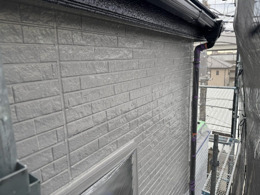 ⇧下塗り後の外壁をひび割れや穴の補修をしてから中塗りしていきます。