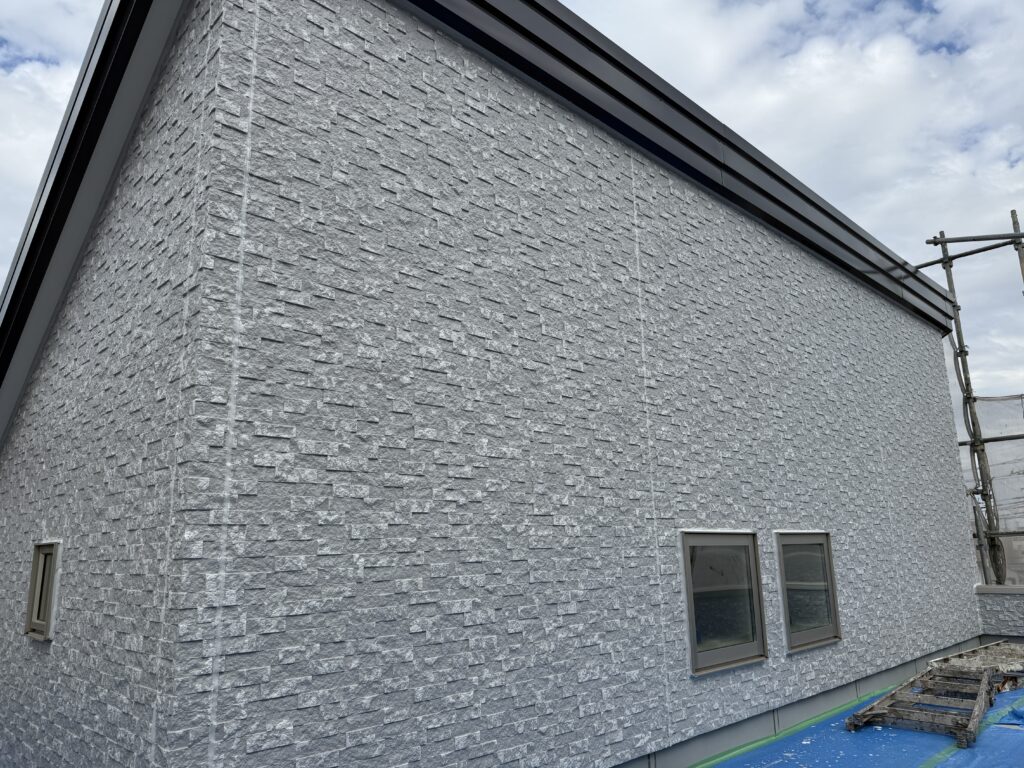 外壁が仕上がってる中、外壁を傷つけることなく、そして汚さないよう、丁寧に気を付けて施工します。