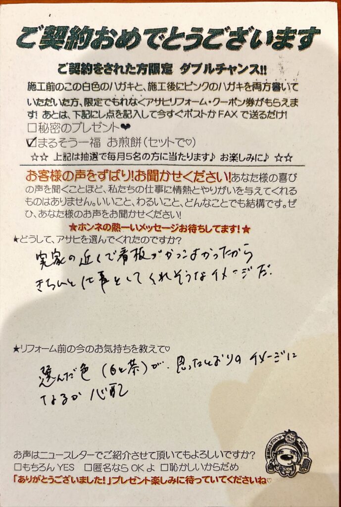 口コミ評判実家の近くで看板が良かったから越谷市袋山 Oさまカスタマーレビュー ★★★★★Q.どうしてアサヒを選んでくれたのですか?実家の近くで看板がかっこよかったから。キチンと仕事をしてくれそうなイメージだQ.リフォーム前の今の気持ちを教えて!選んだ色が思った通りのイメージになるか心配