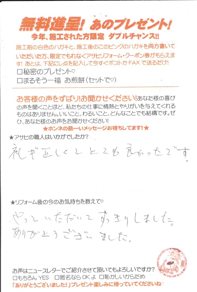 口コミ評判礼儀正しくとても良かったです。越谷市相模町Sさま通常は1枚ずつ掲載してください。カスタマーレビュー ★★★★★Q.アサヒの職人はいかがでしたか?礼儀正しくとても良かったです。Q.今の気持ちを教えて!やっていただいてすっきりしました。ありがとうございます。越谷市相模町Oさま