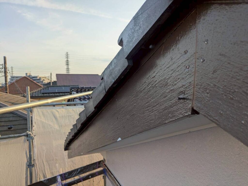 今日の作業は付帯部(樋や破風)の中塗りです。