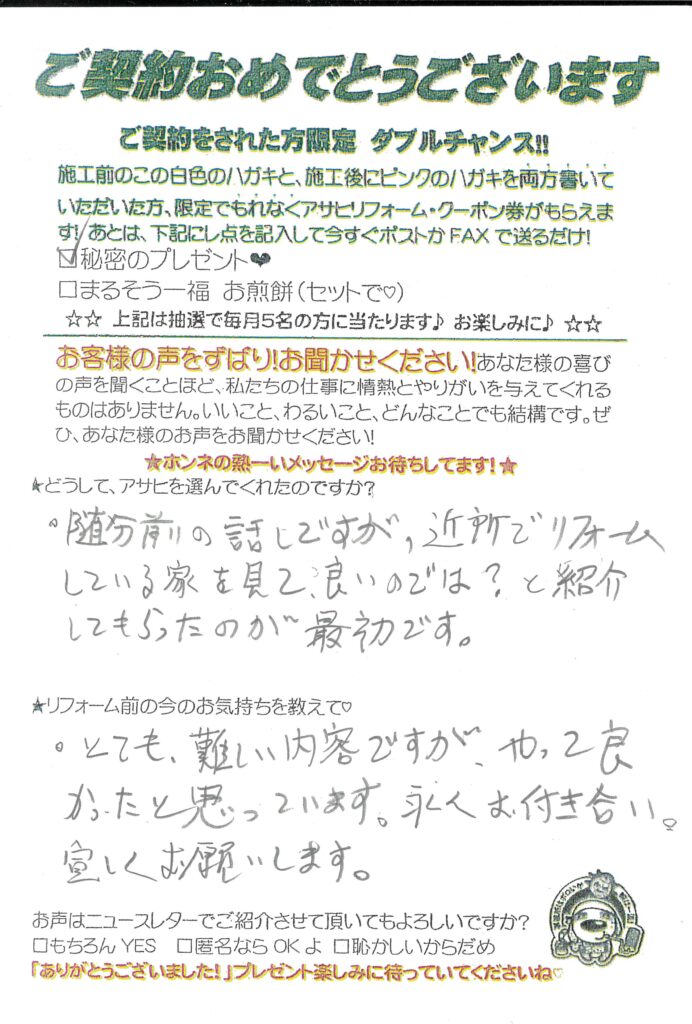 口コミ評判近所でリフォームしている家を見てよいのでは?と紹介してもらったのが最初です。川口市東川口さまカスタマーレビュー ★★★★★Q.どうしてアサヒを選んでくれたのですか?ずいぶん前の話ですが、近所でリフォームしている家を見てよいのでは?と紹介してもらったのが最初です。Q.リフォーム前の今の気持ちを教えて!とても難しい内容ですが、やってよかったと思っています。永くお付き合いよろしくお願いします。