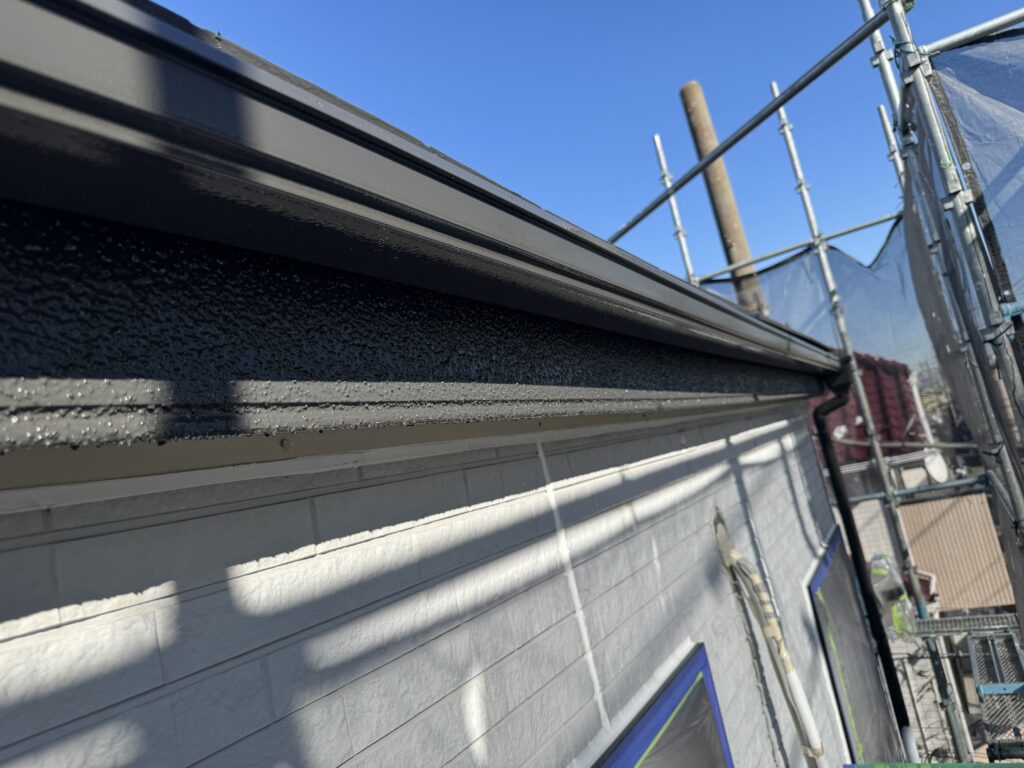 ⇧下塗りが完了して真っ白になった雨樋の中塗りをしていきます。