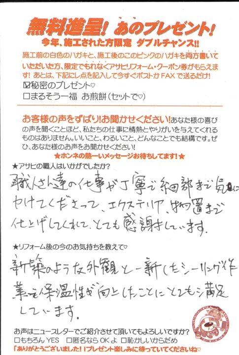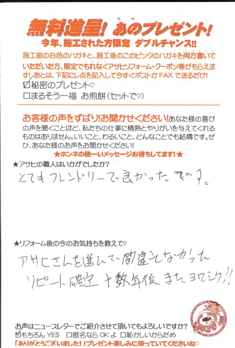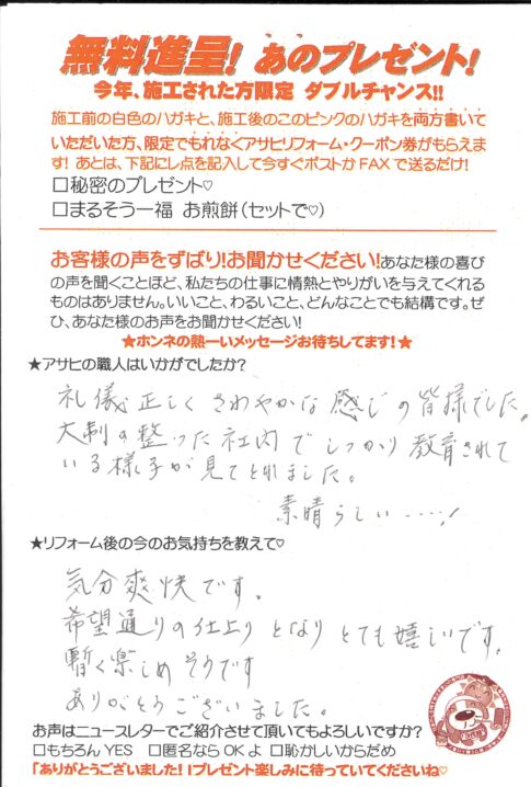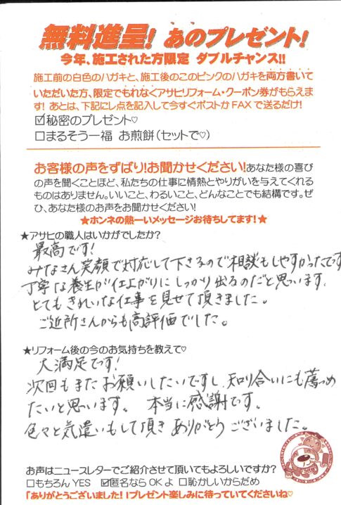 口コミ評判草加市中根Mさま カスタマーレビュー ★★★★★ Q.アサヒの職人はいかがでしたか? とてもフレンドリーで良かったです。 Q.今の気持ちを教えて! アサヒさんを選んで間違えなかった。リピート確定。十数年またヨロシク!! ...