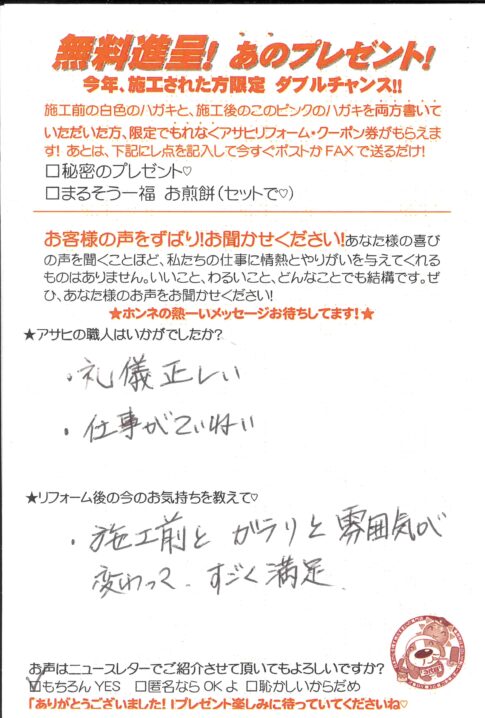 口コミ評判草加市氷川Hさま カスタマーレビュー ★★★★★ Q.どうしてアサヒを選んでくれたのですか? 実績があり地域の方を大切にしていそうだったので。 Q.リフォーム前の今の気持ちを教えて! キレイになるのが楽しみです。 草加市...