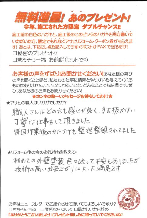 口コミ評判草加市清門Iさま カスタマーレビュー ★★★★★ Q.どうしてアサヒを選んでくれたのですか? 今年に入りいよいよ外壁リフォームをといろいろなチラシやHPを見ては決め兼ねる日々を過ごしていました。アサヒさんのチラシはいつも...