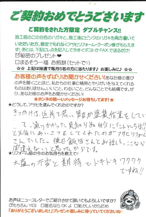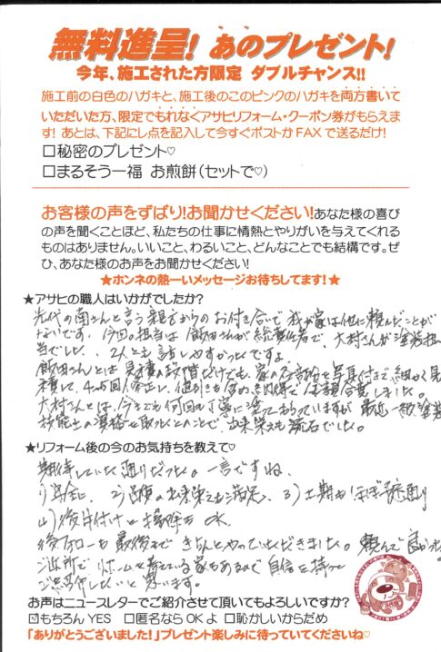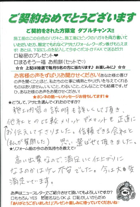 口コミ評判草加市旭町Sさま カスタマーレビュー ★★★★★ Q.どうしてアサヒを選んでくれたのですか? チラシを見て。近所で工事を見て。 Q.リフォーム前の今の気持ちを教えて! 10年以上過ぎたから。 草加市旭町Sさま