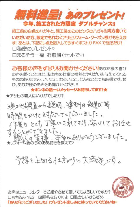草加市八幡 Oさま カスタマーレビュー ★★★★★ Q.どうしてアサヒを選んでくれたのですか? 施工内容の説明も詳しくして頂き、他社との比較メリット、デメリットも正直にお伝えして下さりました。信頼できる会社と思い選ばせて...