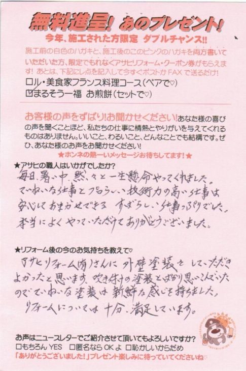 口コミ評判越谷市大房在住 I様 カスタマーレビュー ★★★★★ Q.アサヒの職人はいかがでしたか? 暑い中、真面目にいっしょう懸命やっていただきました。毎日、塗装の手順等を説明してくれたのでわかりやすくて良かったです。鈴木さん、内...