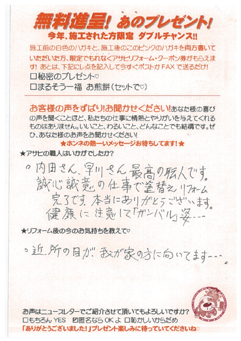 口コミ評判越谷市七左町在住 S様 カスタマーレビュー ★★★★★ Q.アサヒの職人はいかがでしたか? 内田さん、早川さん最高の職人です。 誠心誠意の仕事で塗替えリフォーム完了です。本当にありがとうございます。 健康に注意して「ガン...